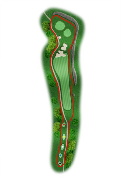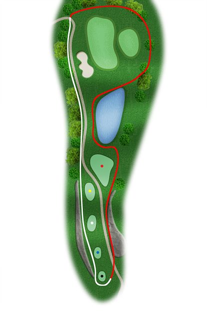 티 샷, 슬라이스 볼은 금물이다. 약간의 좌측을 보는 것이 좋으며, 세컷샷도 그린 우측은 위험하므로 그린 공략은 약간 좌측 방향으로 해야한다.