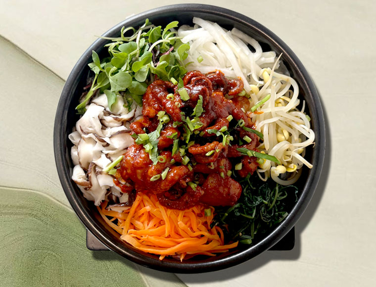 탱글탱글한 주꾸미에 각종 야채를 넣어 매콤소스에 비벼먹는 비빔밥